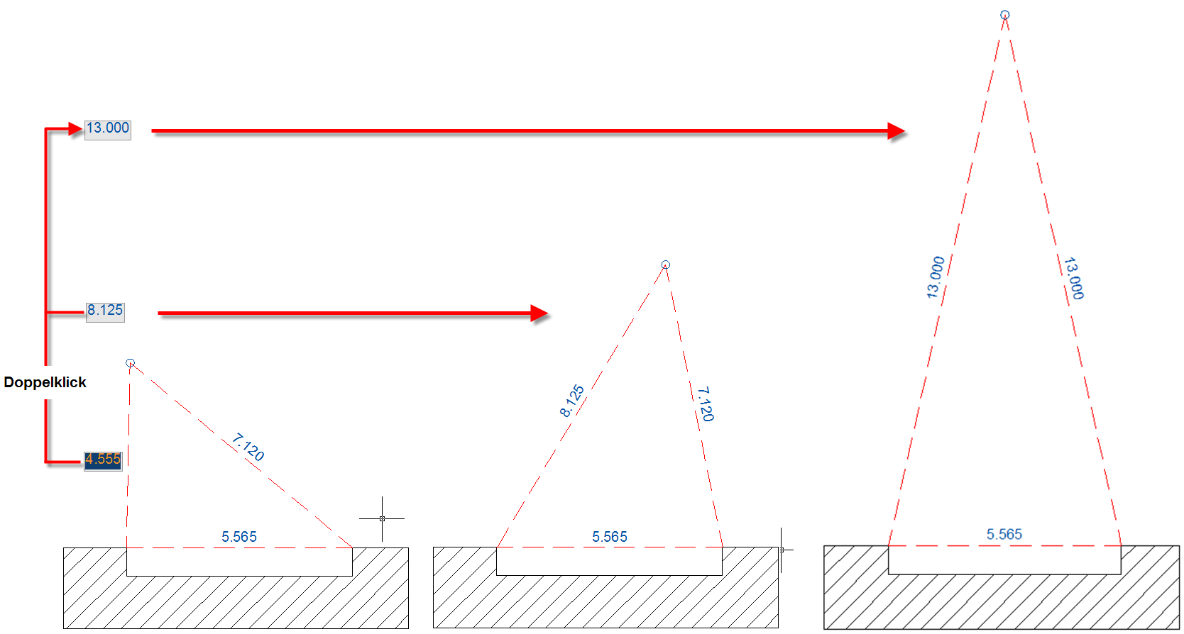 - Bei Dreiecksmessungen dürfen keine negativen Werte eingegeben werden. Ist der neue Wert einer Messlinie zu groß, für einen Schnittpunkt mit der zweiten Messlinie, erhält die zweite Messlinie automatisch den gleichen Messwert, d. h. es entsteht ein gleichschenkliges Dreieck. Anschließend kann bei Bedarf der zweite Messwert editiert werden.