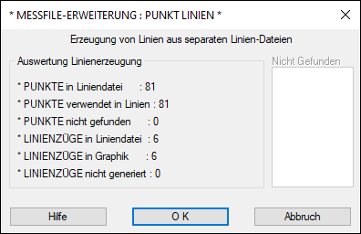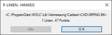 Wählen Sie anschließend die Datei CADUMRNG.BK aus, in dem Sie die Schaltfläche Datei nochmals betätigen. Bei dieser Datei handelt es sich um die Umringgrenze der Punkte, welche z. B. bei der Erstellung eines digitalen Geländemodells von besonderer Bedeutung ist. Geben Sie für diese Linie den Layer UMRING an und bestätigen Sie die Dialogbox abschließend mit OK. Messfile lädt nun nacheinander die angegebenen Dateien und meldet jeweils die Anzahl der darin referenzierten Linien und Punkte. Sie müssen als nächstes die Koordinatendatei (CADSEM.ASC) im Hauptdialog nochmals laden, da die Messfile-Erweiterungen immer nur im Zusammenhang mit dem Laden einer Koordinatendatei funktionieren.