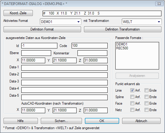 Im Hauptfenster des Formatdialoges stellt Messfile dar, wie eine konkrete Zeile aus Ihrem Koordinaten-File mittels des aktivierten Datei-Formates ausgewertet wird und zeigt die erkannten Anteile dieser Zeile in den entsprechenden Datenfeldern. Zusätzlich werden die, unter Berücksichtigung der aktiven Transformation, erzeugten CAD-Koordinaten zur Anzeige gebracht.