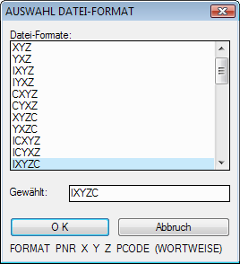Durch das Datei-Format wird Messfile bekannt gegeben, wie es die Zeilen der Koordinatendatei zu interpretieren hat, und welche Anteile der Koordinaten-Zeile für die Darstellung der Daten im CAD-System verwendet werden können. Das Format können Sie aus einer Dialogbox auswählen, nachdem die Schaltfläche Format im Hauptdialog betätigt wurde. Die Dateiformate erscheinen in einer Kurzform. Hierbei bedeuten: