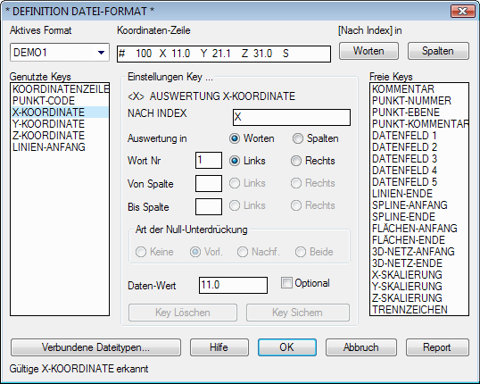 Übersteigen die in der Koordinatendatei enthaltenen Daten die im Format festgelegten Definitionen oder wird die Datei nicht richtig interpretiert, können Sie ein neues Format durch Betätigung der Schaltfläche Definition Format frei definieren. Die Definition über Art u. Weise der Erkennung bestimmter Datenwerte in der Koordinatenzeile erfolgt mittels so genannter Keys. Eine Key-Definition legt zum einen fest, welcher Art der ausgewertete Teil der Koordinatenzeile ist (z.B. Punktnummer, Koordinate etc.), andererseits wird damit auch festgelegt, wie diese Erkennung erfolgt. Messfile zeigt Ihnen mit einem entsprechenden Schaltfeld bzw. mit einer Popup-Liste alle zur Verfügung stehenden und bereits definierten Formate. Falls Sie jedoch ein neues Format erzeugen wollen, nutzen Sie am besten zuerst die Analyse-Funktion im Hauptfenster des Format-Dialoges, um alle näherungsweise passenden Dateiformate auflisten zu lassen. Die Analysefunktion startet einen Testlauf, in welchem Messfile alle vorhandenen Datei-Formate einzeln auf ihre Anwendbarkeit bezüglich der ausgewählten Dateizeile prüft. Im Ergebnis dieser Analyse zeigt Messfile die möglicherweise in Betracht kommenden Datei-Formate in der darüber stehenden Liste. Da alle Punkteigenschaften, mit Ausnahme der X-, Y-, Z-Koordinaten, nicht numerisch zu sein brauchen, müssen die gefundenen Datei-Formate nicht zwangsläufig auch wirklich die Struktur der Koordinaten-Zeile treffen. Messfile kann lediglich prüfen, ob ein konkretes Datei-Format mindestens die Koordinaten als numerische Werte herausfiltert. Die Entscheidung darüber, ob ein Datei-Format für eine ausgewählte Koordinatendatei in Frage kommt, kann nur von Ihnen getroffen werden. Wählen Sie daher ein Format nach dem anderen an, und verfolgen Sie in den Datenfeldern, wie die einzelnen Datei-Formate die Koordinatenzeile interpretieren. Zusätzlich gibt Messfile am unteren Rand der Dialogbox noch eine Meldung aus, welche informativen Charakter besitzt und Ihnen ggf. weitere Hinweise gibt. Die Aktualisierung der Anzeige-Felder erfolgt automatisch, wenn Sie: