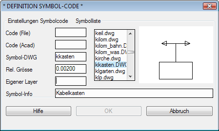 - Symbol für den Punktcode - In das Feld SYMBOL-DWG tragen Sie bitte den Namen des Symbol- Zeichnungsblockes ein, welcher dem angegebenen Punktcode zugeordnet werden soll. Die richtige Auswahl dieses Symbols wird Ihnen durch die nebenstehende Liste der verfügbaren Symbole des aktuellen Symbol-Pfades als auch durch die Darstellung des zugehörigen Dias (falls existent) erleichtert.
