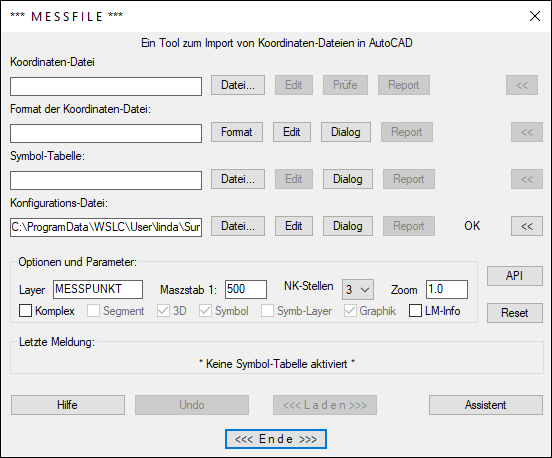 Sie können bereits in der Konfiguration den Namen einer Koordinatendatei vorgeben. Eine Festlegung der Koordinatendatei dürfte aber nur dann sinnvoll sein, wenn mit einer Konfiguration wirklich eine feststehende Koordinatendatei verbunden ist. Anderenfalls müssten Sie nach der Auswahl dieser Konfiguration immer erst die Koordinatendatei nochmals auf dem Hauptdialog auswählen.