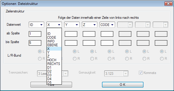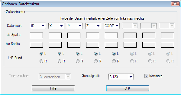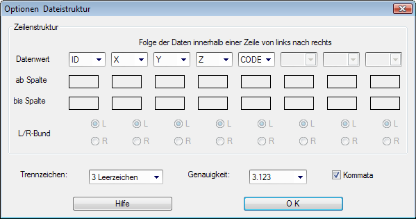 Beim Laden einer Koordinatendatei können mit Angepasst die exakten Spalten-Positionen der Datenwerte in der Zeile angegeben werden. |