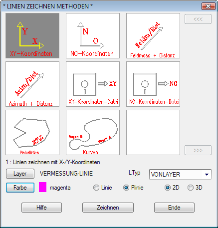Dieses Verwaltungs-Programm bietet Ihnen eine Reihe von vermessungstechnischen Methoden zum Zeichnen von Linien und Bögen. Jedes Verfahren wird durch ein Bild in einer Manager-ähnlichen Oberfläche dargestellt, und ist mit diesem auch wählbar. Vor der Generierung der Elemente können Sie deren Layer, Elementfarbe und den Linientyp einstellen. Diese, als Vorgabe speicherbaren, Eigenschaften werden nur auf die durch das Programm gezeichneten Elemente angewendet und nach Beendigung des Programms wieder auf die zuvor in der Zeichnung aktuellen Werte gesetzt. Mit den Schaltern Linie/Plinie und 2D/3D kann die Art der gezeichneten Linien gesteuert werden. |