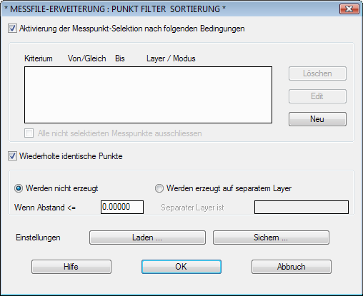 Diese Messfile-Erweiterung hat die Aufgabe, Messpunkte mit spezifischen festzulegenden Eigenschaften zu selektieren und diese dann separat zu behandeln. Es bestehen Möglichkeiten zur Generierung der selektierten Messpunkte auf eigenen Layern bzw. zur Unterdrückung der ausgewählten Messpunkte. Hierbei können beliebig viele Bedingungen zur Selektion der Messpunkte aufgestellt werden. Unabhängig davon besteht die Möglichkeit, identische bzw. quasi identische Messpunkte zu unterdrücken. Dabei werden alle Messpunkte, welche sich innerhalb einer einstellbaren Toleranz zu bereits existierenden Messpunkten befinden, nicht in der CAD-Grafik generiert. Andererseits können Sie aber auch diese quasi identischen Messpunkte auf einem eigenen Layer generieren lassen, um diese Messpunkte nicht zu verlieren. Beim Prüfen u. Laden einer Koordinatendatei werden durch P-FILTER auch entsprechende Protokolle im Prüf-/Lade-Report erzeugt; daraus ersehen Sie, ob und wie P-FILTER die Messpunkte bearbeitet. Nach der Auswahl dieser Erweiterung wird die Schaltfläche MODIF.DATA freigegeben, welche den entsprechenden Dialog öffnet.