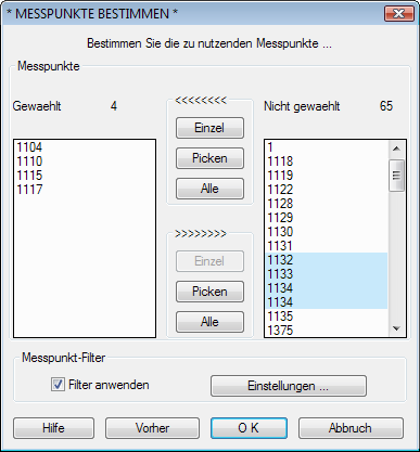 Der Auswahl-Dialog erlaubt sowohl eine sehr schnelle wie auch komfortable Auswahl von bestimmten Messpunkten, inklusive der Verwendung des Messpunkt-Filters. Es werden stets 2 Listen im Dialog angezeigt: