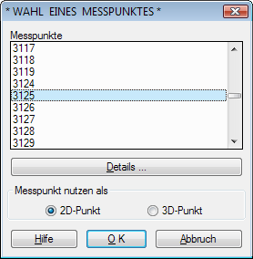 Die Messfile-Tools beinhalten auch einen speziellen Objektfang: den Messpunkt-Objektfang: Um einen Messpunkt zu fangen, geben Sie bitte auf die Anfrage nach einem Punkt 'MFP ein - das Hochkomma ist wichtig, damit das CAD-System den Befehl transparent ausführt. Es erscheint eine Anfrage nach der Punktnummer: wenn Sie die Punktnummer (ID) des Messpunktes kennen, geben Sie diese bitte ein; anderenfalls gelangen Sie mit der Leertaste/Return (also mit einer Leereingabe) in einen Auswahl-Dialog, welcher Ihnen alle in der Zeichnung enthaltenen Messpunkte auflistet. Hier können Sie nun den Messpunkt direkt aus der Liste wählen. WICHTIG: Sie können einstellen, ob der Messpunkt als 2D- oder als 3D-Punkt zurück geliefert wird. Voreinstellung ist 2D! Wenn Sie später auf die Messpunkt-Anfrage direkt die Punktnummer (also ohne Dialog) eingeben, wird immer die zuletzt verwendete Einstellung 2D/3D verwendet! |