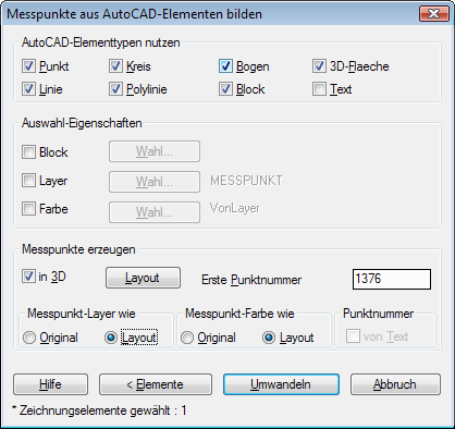 Wenn Sie auch Textelemente umwandeln lassen, so besteht zusätzlich die Möglichkeit, den Textwert selbst als Punktnummer zu verwenden; dazu muss der Schalter Punktnummer / von Text gesetzt werden. Dieser ist als Default ausgeschaltet.