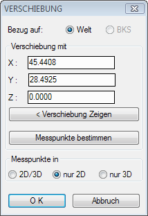 Diese Funktion erlaubt die globale Verschiebung von gewählten Messpunkten um einen frei wählbaren Betrag in X-, Y- und Z-Richtung. Der Vierschiebungsbetrag kann in Bezug auf das Welt-Koordinaten-System oder in Bezug auf das aktuelle Benutzer-Koordinatensystem erfolgen; ebenso kann die Verschiebung auch direkt in der Zeichnung mit <Zeigen gezeigt werden.