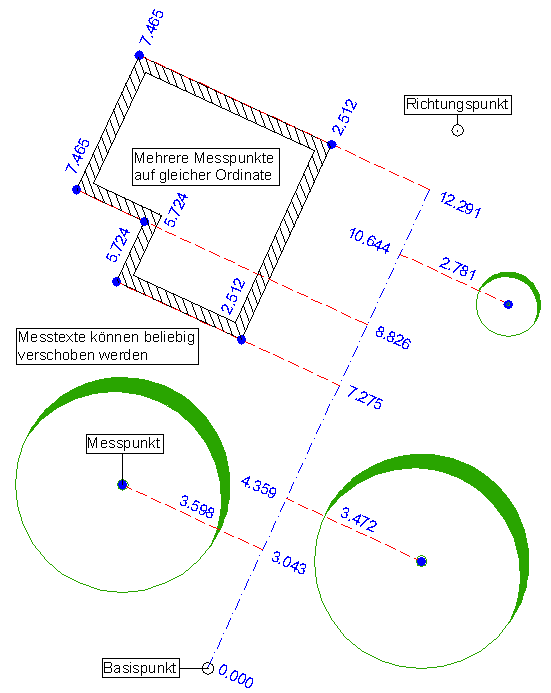 Beim Orthogonalmaß wird die Richtung der Messachse (Abszisse) standardmäßig durch die Verbindung zweier, im Gelände bekannter Punkte (z.B. Grenzsteine, Grundstücksecken etc.) definiert. Sie werden aufgefordert zunächst einen Basispunkt als Ausgangspunkt der Abszisse und anschließend einen Richtungspunkt anzugeben. Der Basispunkt wird hierbei als Nullpunkt beschriftet, wobei die Anzahl der Nachkommastellen der im Hauptdialog eingestellten Genauigkeit entspricht. Sie können nun beliebig viele Punkte in der Zeichnung zeigen, welche daraufhin bemaßt werden. Das Abszissenmaß wird stets fortlaufend berechnet und an die Messachse geschrieben. Das Ordinatenmaß steht i. d. R. mittig zentriert über der Ordinate. Liegen jedoch mehrere Messpunkte auf der gleichen Ordinate, wird die Ordinatenbemaßung um 90 Grad gedreht und ebenfalls fortlaufend neben den Messpunkt geschrieben. Dieser Mechanismus erfolgt vollautomatisch, sobald ein zweiter Punkt die gleiche Ordinate belegt, d. h. das zentrierte Zwischenmaß des ersten Punktes wird automatisch geändert. In der Praxis ist es empfehlenswert, den Richtungspunkt ebenfalls als zu vermaßenden Punkt zu zeigen, damit die Absteckung nachvollziehbar bleibt. |