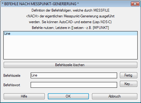 Demgegenüber werden die unter Pre- bzw. Post-Kommandos definierten Befehlsfolgen immer VOR bzw. NACH und unabhängig von der Messfile eigenen Punktgenerierung abgearbeitet. Somit haben Sie also eine Möglichkeit, zusätzlich zur Messfile-Punktgenerierung, eigene und spezifische Befehle für jeden Messpunkt ausführen zu lassen. Unabhängig von der Art und Weise der Messpunkt-Generierung ist die Erzeugung der Symbole (entspr. Punktcode) und die Erzeugung der Liniengrafik (Polygone, Splines, Flächen, Netze). Wenn Sie diese Befehlsfolgen nutzen wollen, können Sie diese unter Pre- bzw. Post-Kommandos definieren. Dort tragen Sie die gewünschten Befehlszeilen als Textzeile ein, die Daten-KEYs stehen über eine Auswahl-Liste zur Verfügung.