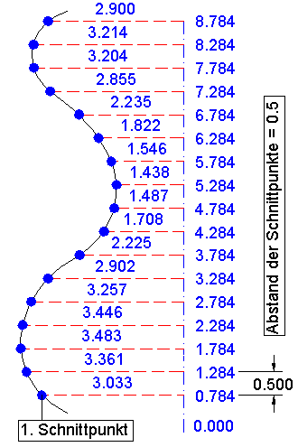 Die Funktion Rasterschnittpunkte steht zur Auswahl, nachdem die Messachse mittels zweier Punkte oder einer Flucht definiert ist. Sie erlaubt es Ihnen jederzeit, eine ausgewählten 2D/3D-Polylinie fortlaufend mit einem definierten Regelabstand automatisch zu bemaßen. Dadurch ist ein enormer Automatismus in der Bemaßung gegeben, welche auch bei einer anschließenden Abrechnung eine Rationalisierung erwirkt. Nach der Wahl der Polylinie ist zunächst der Abstand der Schnittpunkte anzugeben. Damit wird ein festes Bemaßungsintervall für die Abszisse festgelegt, von dem aus rechtwinklig und bei Bedarf beidseitig auf die Kontur gemessen wird. Anschließend ist der erste Schnittpunkt (Anfangs-Messpunkt) mit der Polylinie zu wählen. Die Polylinie wird daraufhin automatisch und ausgehend vom ersten Schnittpunkt mit dem gleich bleibendem Abszissenabstand bemaßt. Es ist dabei völlig unerheblich ob die Polylinie offen oder geschlossen ist oder welche Lage die Abszisse zur Polylinie einnimmt. Die Abszisse kann innerhalb oder außerhalb der Polylinie liegen |