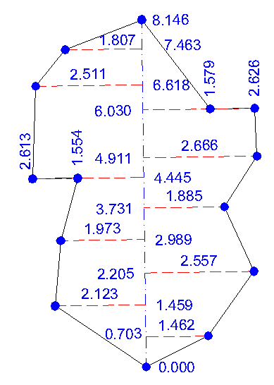 Die Funktion Stützpunkte steht zur Auswahl, nachdem die Messachse mittels zweier Punkte oder einer Flucht definiert ist. Sie erlaubt es Ihnen jederzeit, die Stützpunkte einer ausgewählten 2D/3D-Polylinie automatisch zu bemaßen. Dadurch ist ein enormer Automatismus in der Bemaßung gegeben, welche auch bei einer anschließenden Abrechnung eine Rationalisierung erwirkt. Es ist dabei völlig unerheblich ob die Polylinie offen oder geschlossen ist oder welche Lage die Abszisse zur Polylinie einnimmt. Die Abszisse kann innerhalb oder außerhalb der Polylinie liegen, wobei selbst negative Abszissenwerte unterstützt werden. Bei Polylinienbögen werden die echten Stützpunkte bemaßt, nicht aber die Bogenmittelpunkte. Bitte beachten Sie, dass die Funktion Stützpunkte kein abgeschlossener Einzelbefehl ist, sondern während der Anwendung mit der normalen Einzelbemaßung und jeder weiteren Option kombinierbar ist. |