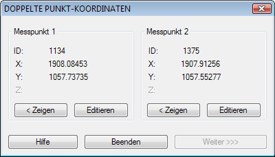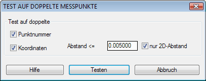 Ist dieser Schalter dagegen nicht gesetzt, erfolgt die Abstandsberechnung mit allen 3 Koordinaten (Lage+Höhe, X,Y,Z) als räumlicher Abstand. Nach Einstellung aller Optionen und Parameter starten Sie die Prüfung. Werden doppelte Messpunkte gefunden, so erscheint eine Dialogbox zur paarweisen Behandlung von 2 gleichen Messpunkten. |