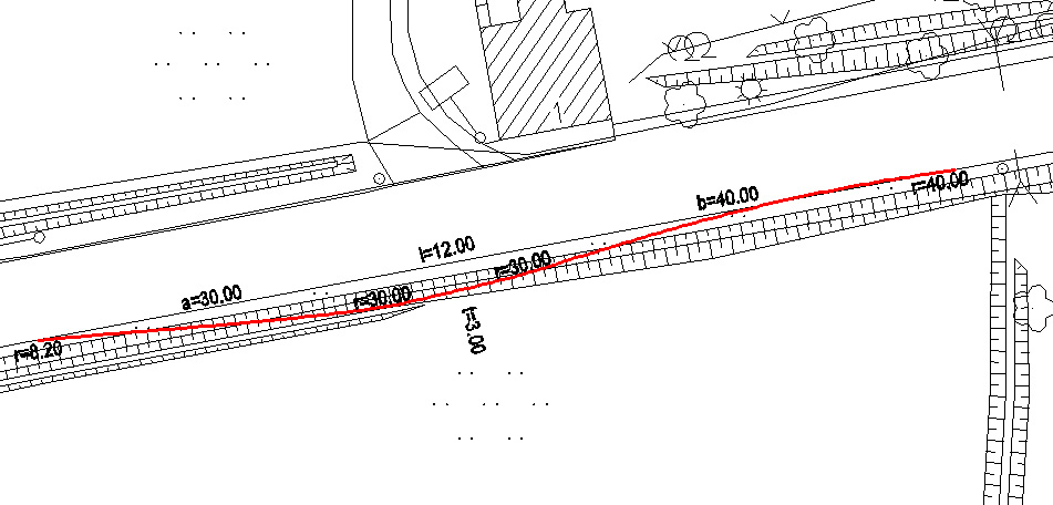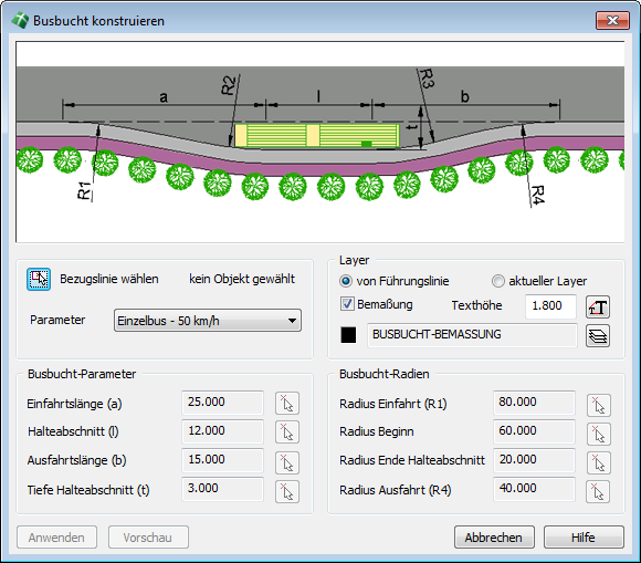 Für die Busbucht erstellte Führungslinien werden entweder auf dem aktuellen Layer oder dem der Bezugslinie erstellt und bestehen bei einer geraden Bezugslinie aus Linien und Bögen. Handelt es sich um eine gekrümmte Bezugslinie, dann wird die zu erstellende Führungslinie aufgerastert und als Polylinie aus Liniensegmenten erstellt.