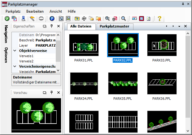 Der Parkplatzmanager dient der Generierung, Verwaltung und Anwendung beliebiger Parkplatztypen (Stellplätze), welche je nach Aufstellart, Größe, Ausmaß und Optik als individuelles Muster zusammengefasst werden. Das Programm eignet sich aufgrund seiner Flexibilität sowohl zur reinen Visualisierung in der Stadt- und Objektplanung als auch zur Entwurfs- und Detailplanung. Durch die Verwendung des WS LANDCAD-Managerprinzips können beliebig viel Parkplatztypen erstellt und in Verzeichnissen abgelegt werden, die z. B. nach Anwendungsbereichen geordnet sein können. Es ist ebenfalls möglich, beliebige Varianten von bestehenden Parkplatztypen zu erzeugen, diese in der Zeichnung anzuwenden und bei Bedarf separat, also als neues Muster, zu speichern. Die Parkplatztypen werden in den Verzeichnissen nicht als Zeichnungsblöcke, sondern als parametrische Textdateien (*.PPL) abgelegt und können sich daher beim Anwenden an jeder beliebigen Straßenlinie ausrichten. Das Programm orientiert sich an den in der EAE 85/95 (Empfehlungen für die Anlage von Erschließungsstraßen von der Forschungsgesellschaft für Straßen- und Verkehrswesen) erfassten Grundformen und Parametern und bietet darüber hinaus die praxisgerechte Möglichkeit, frei definierbare Sonderfälle, z. B. Behindertenparkplätze und Baumscheiben, dynamisch in die Muster zu integrieren. Da in den Mustern beliebig viele frei platzier- und skalierbare Zeichnungsblöcke, z. B. Baumsymbole, enthalten sein können, ist mit der Anwendung des Parkplatzmanagers eine enorme Automatisierung im Planungs- und Zeichnungsbetrieb gegeben.