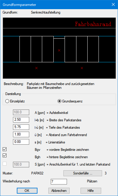 Die Auswahl des Befehls Parkplatzmustereigenschaften aus dem Pull-down-Menü Bearbeiten oder dem Kontextmenü bietet die Möglichkeit, alle Daten des ausgewählten Parkplatzmusters einzusehen und zu verändern. Es wird eine Dialogbox geöffnet, in der die Parameter der Grundform sowie deren stilisierte Grafik eingeblendet werden. Mit den Darstellungsschaltern kann zwischen der Grundsequenz und einem Einzelplatz gewechselt werden. Während die Einzelplatzdarstellung die Parameter nur für den Normalfall grafisch darstellt, ist in der Grundsequenz das gesamte Muster inkl. vorhandener Blockeinfügepunkte ersichtlich.
