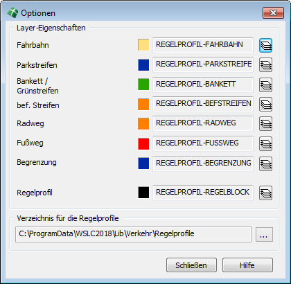 Alle Elemente dieser Funktion können auf spezifischen Layern abgelegt werden, um die Zeichnung optimal zu strukturieren. Hierbei wird der zentrale Layerdialog aufgerufen, um den jeweiligen Layer auszuwählen oder zu erzeugen. In der zentralen Layersteuerdatei WSLC.INI sind bereits entsprechende Vorgabelayer vorhanden, denen stets das Präfix REGELPROFIL vorangestellt ist, z. B. REGELPROFIL-PARKSTREIFEN. Die Layerliste kann mit Hilfe des zentralen Layerdialoges beliebig angepasst und erweitert werden. Im unteren Dialogbereich befindet sich eine Auswahlmöglichkeit für das Verzeichnis der Regelprofile. Dieses befindet sich standardmäßig im Bibliotheksverzeichnis \Lib\Verkehr\Regelprofile. Die darin enthaltenen Profile sollten nicht verändert werden, da sie programmtechnisch direkt zugeordnet sind. |